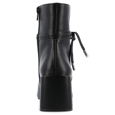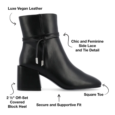 Introducing Beverley, the classic wardrobe staple bootie from Journee Collection. Made from soft luxe vegan leather with a 2 1/2-in off-set covered block heel, a strap with knot detail, and square-toe, Beverley is the perfect combination of timeless style and modern sophistication. With a zipper entry and 4 mm Tru Comfort Foam™ insole, Beverley ensures a comfortable fit all day long, making it a must-have addition to any wardrobe.