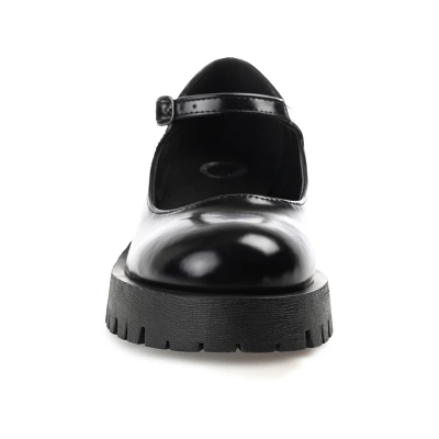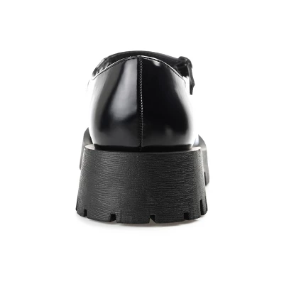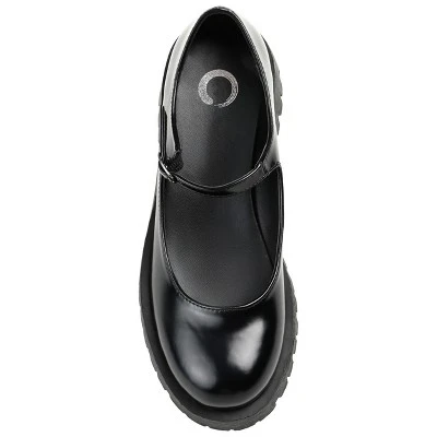 An iconic 90s style revived for the modern fashionista the Kamie flats by Journee Collection. This bold mary jane boasts glossy vegan leather uppers elevated by a chunky treaded platform sole. A round-toe and buckle detail make this statement piece an absolute classic. At Journee Collection, our flat styles will have you looking just as professional as the boss at work to having the cutest shoes when you go out for the night.