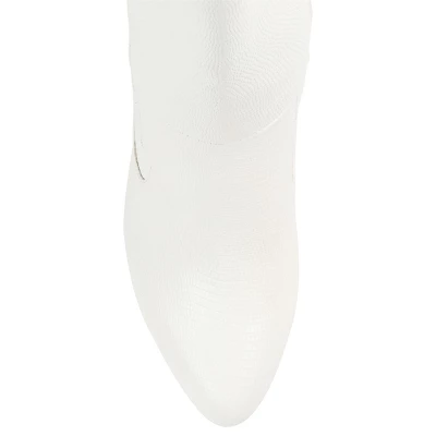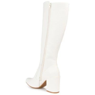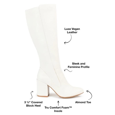 Boots that make the outfit. The Tavia boots by Journee Collection feature lizard textured vegan leather uppers that rise to the knees, detailed with an inside zipper. A 4 mm Tru Comfort Foam™ footbed makes them comfortable to stand in, and a block heel adds the perfect amount of height. At Journee Collection, our boot styles will have your outfit looking even better than before. They will give you that finishing touch that will have your outfit looking straight out of a magazine.